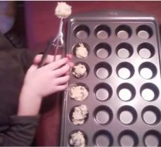Next mash up your bananas in a large bowl and combine sugar, egg, and melted butter. Slowly mix in the flour, mixture until smooth. Scoop into muffin pans. I love using our little scooper from the Pampered chef, but a spoon will work too.