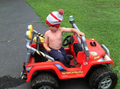 This picture was taken earlier this summer. He got himself ready for an adventure on the power wheels.
