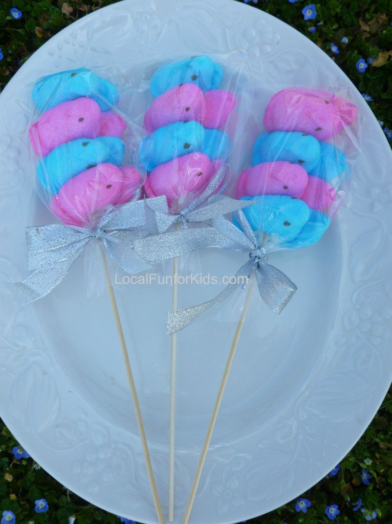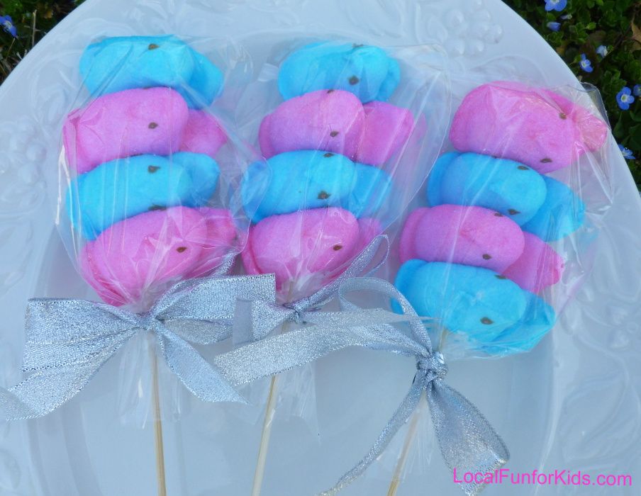 The only little tip I can give you is: don't get worried if the peeps look separated or loose when you first put them on the stick. As soon as you slide them into the treat bag and secure it with the twist tie they will tighten up. Adding a pretty ribbon makes it all come together!